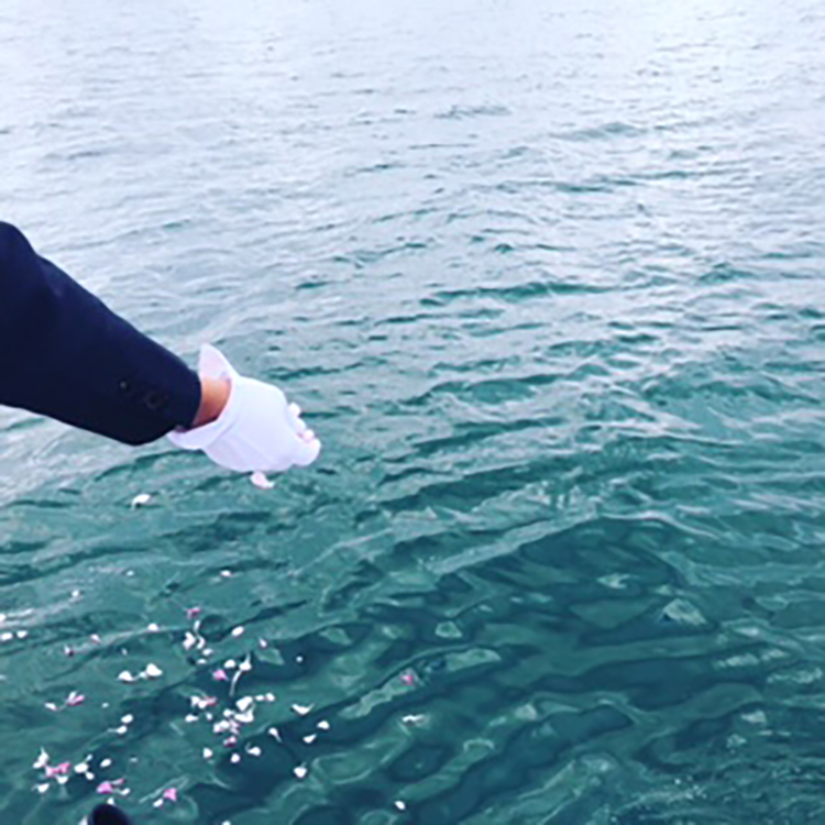 | Step3) | 粉骨後、思い出の海へ散骨いたします。 |