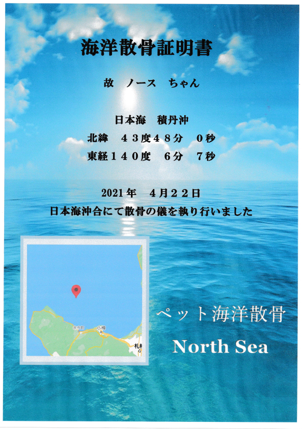 | 合同海洋散骨 | 1~2ヶ月程度の期間にご依頼頂いたペットちゃんの遺骨を一緒に散骨するプラン |